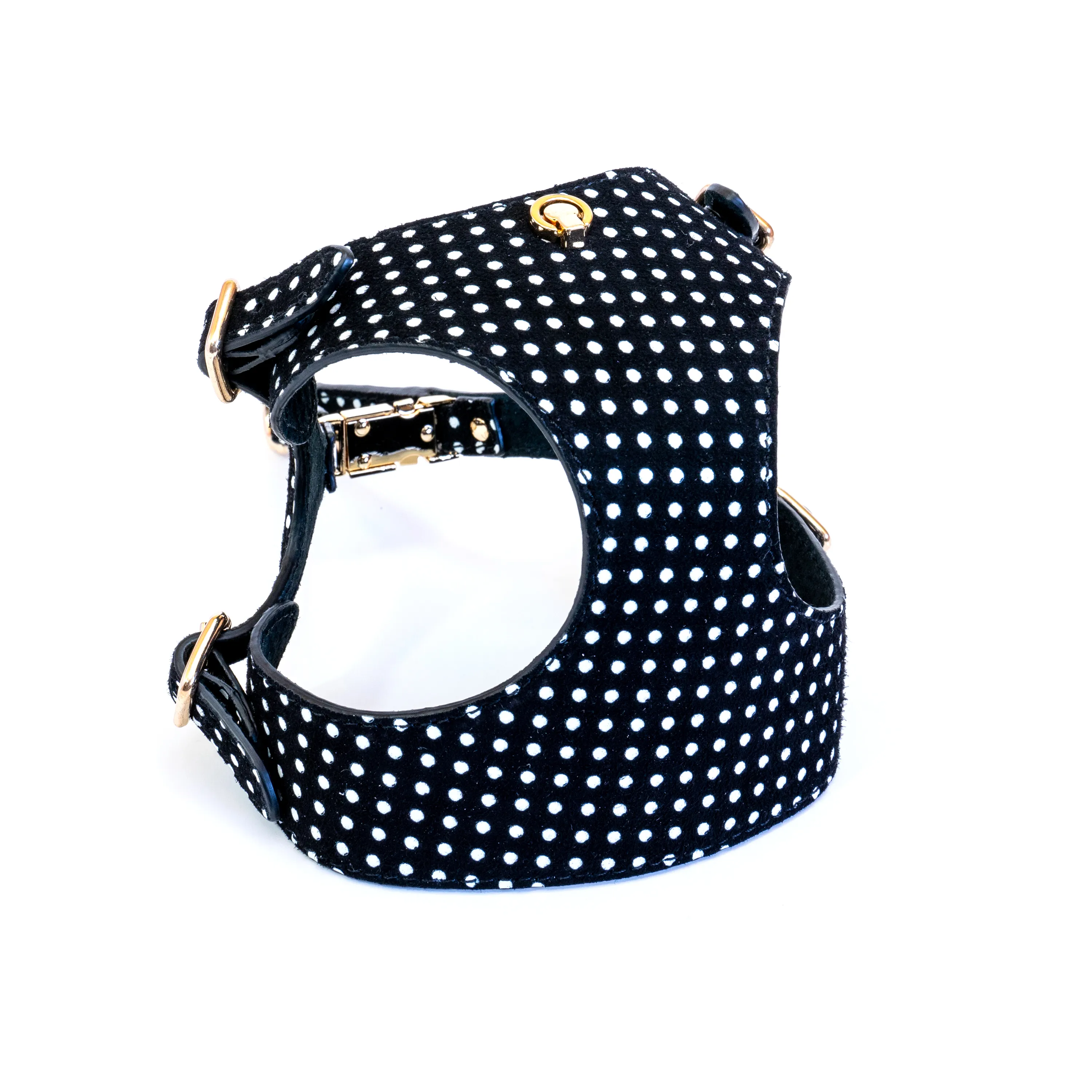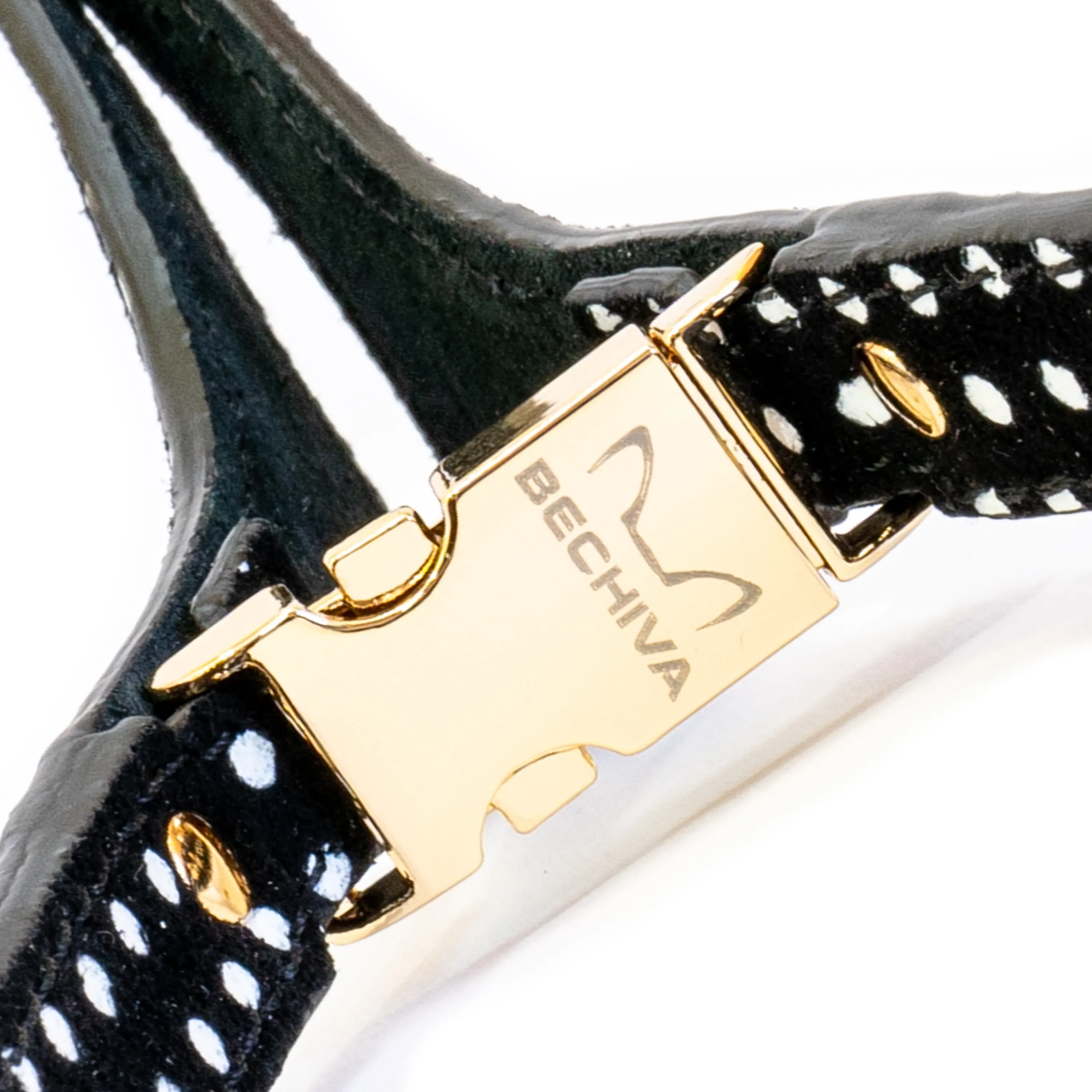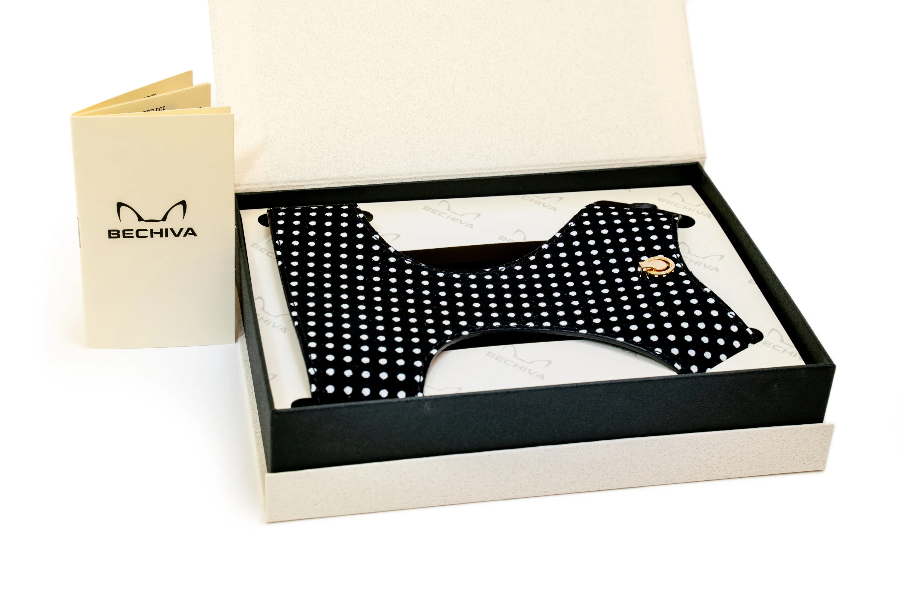 Finished with premium Italian metal hardware in your choice of gold, silver or black, the harness includes a sturdy D-ring for easy lead attachment. Whether for everyday walks or special outings, the Tino harness pairs timeless design with exceptional craftsmanship. Beautifully presented in Bechiva's signature gift box, it's an ideal choice for pet owners seeking comfort, elegance and quality in one beautifully made piece.
