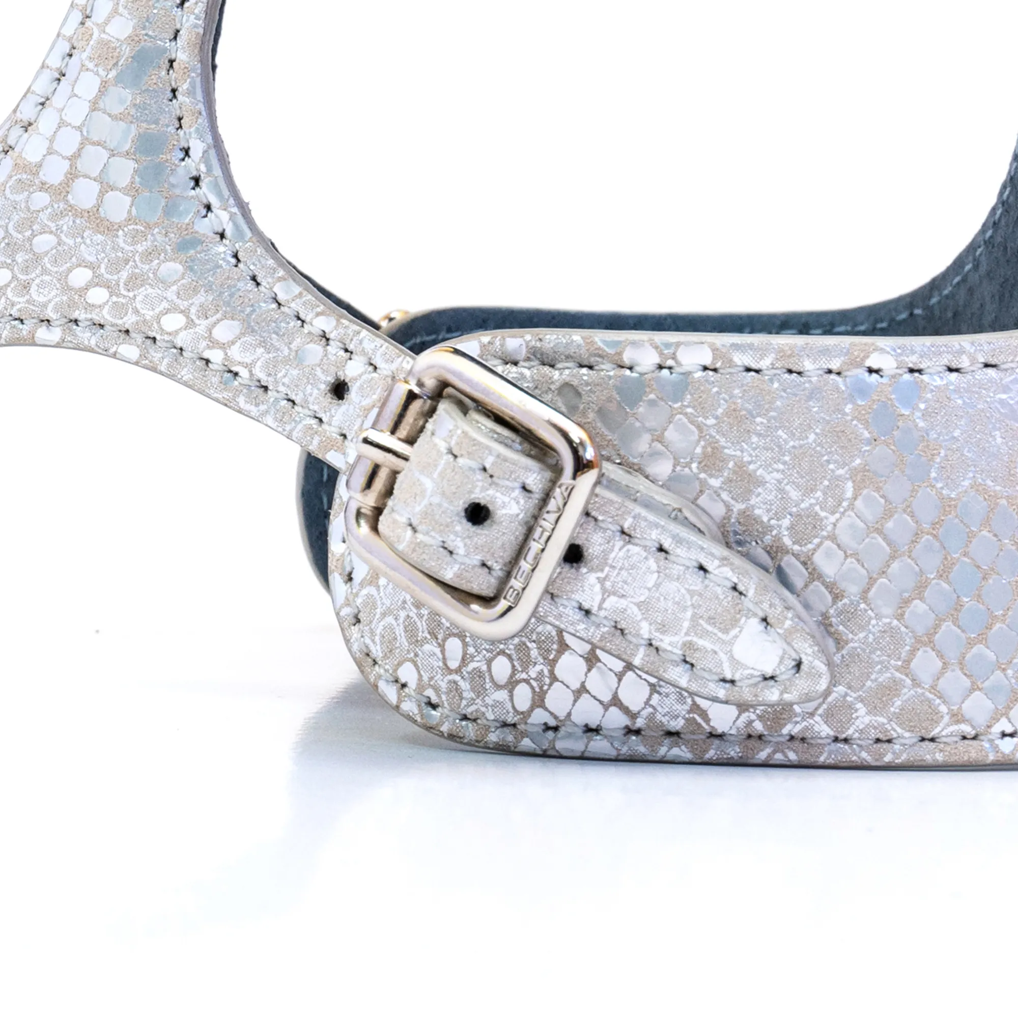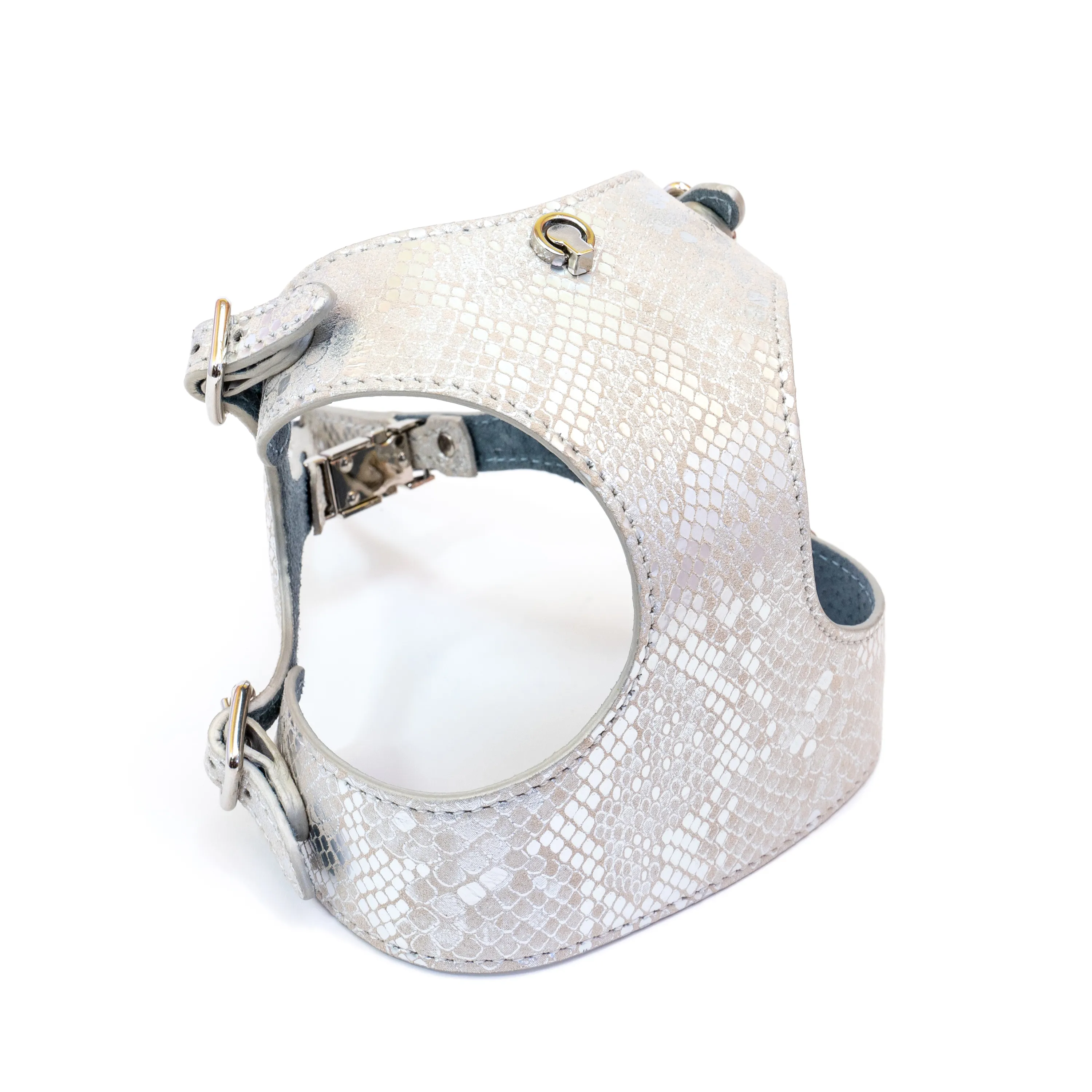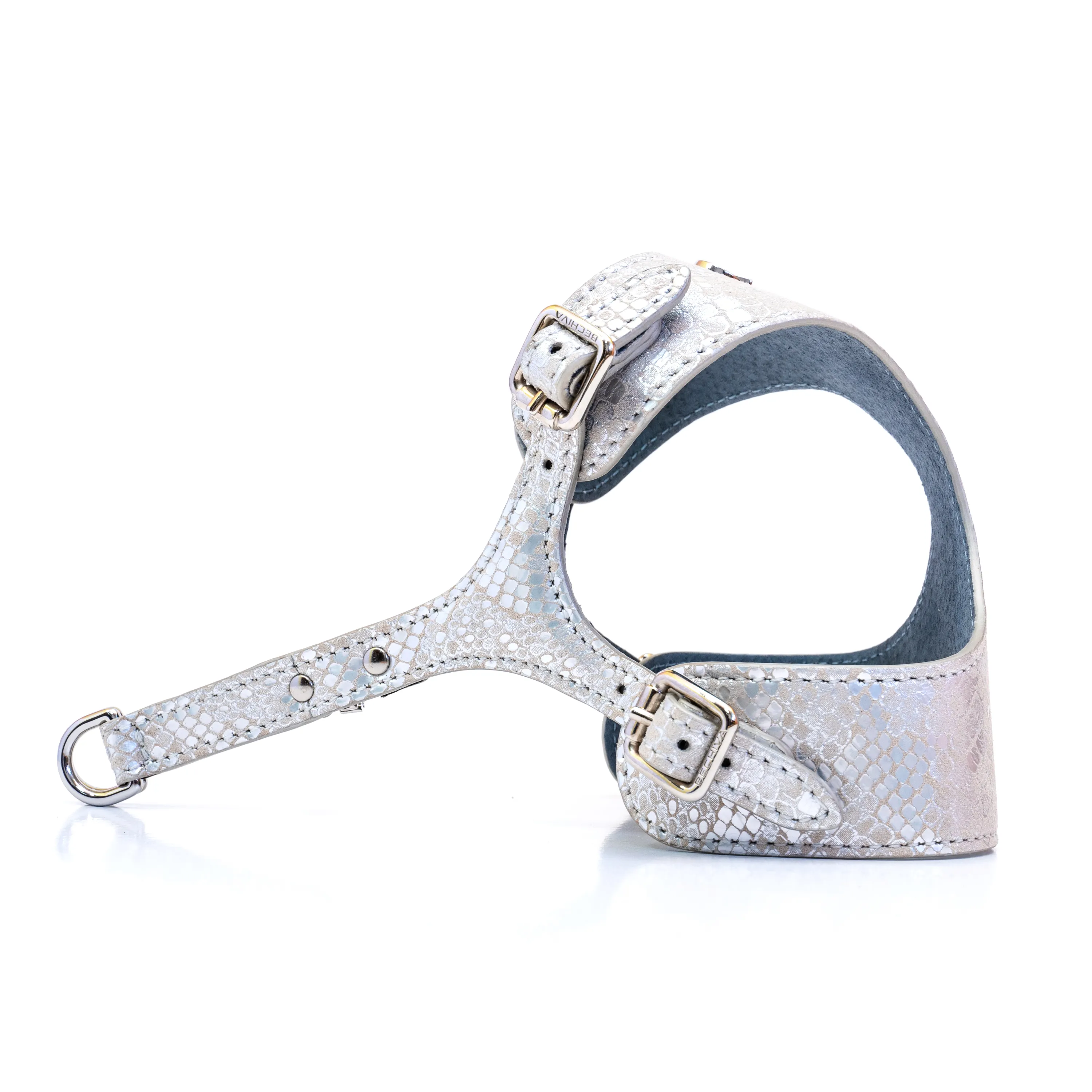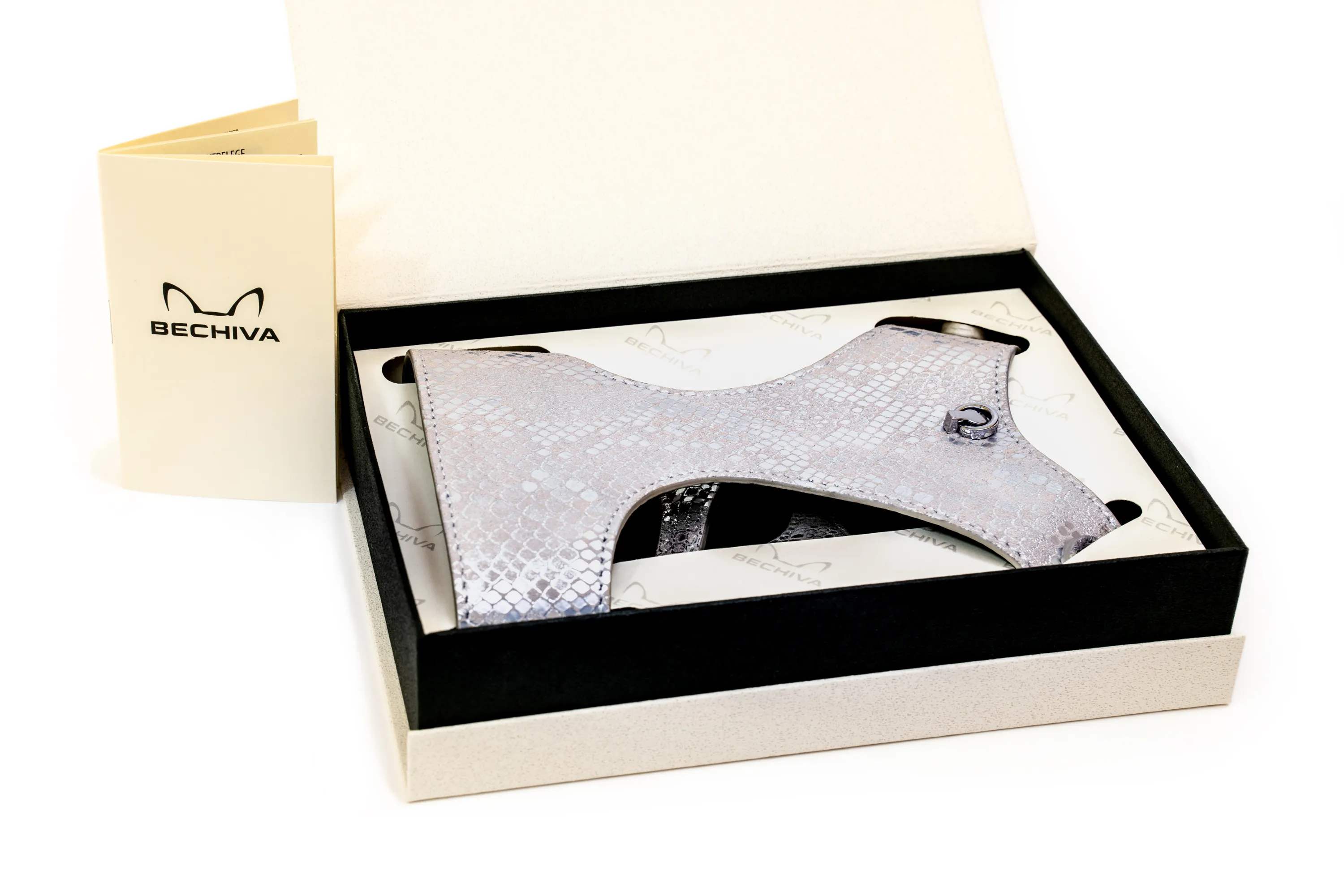 Finished with premium Italian metal hardware in your choice of gold, silver or black, the harness includes a sturdy D-ring for easy lead attachment. Whether for everyday walks or special outings, the Tino harness pairs timeless design with exceptional craftsmanship. Beautifully presented in Bechiva's signature gift box, it's an ideal choice for pet owners seeking comfort, elegance and quality in one beautifully made piece.