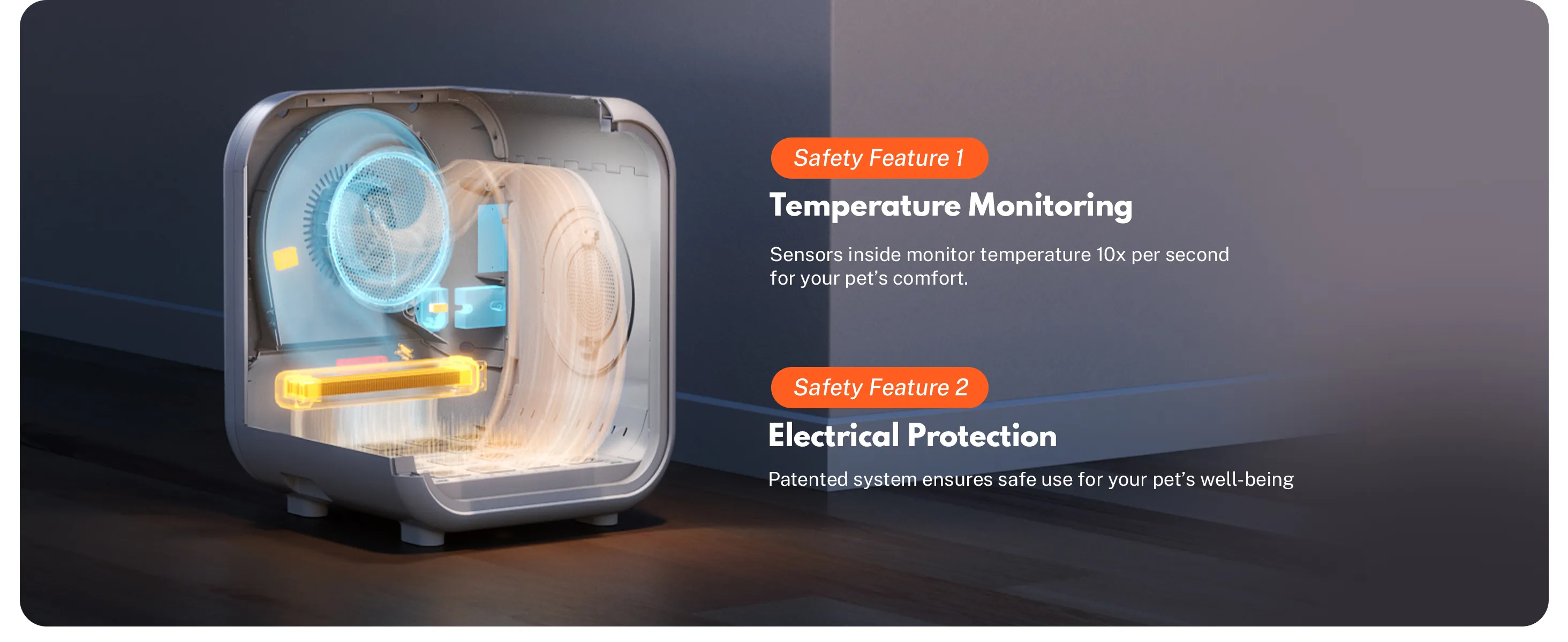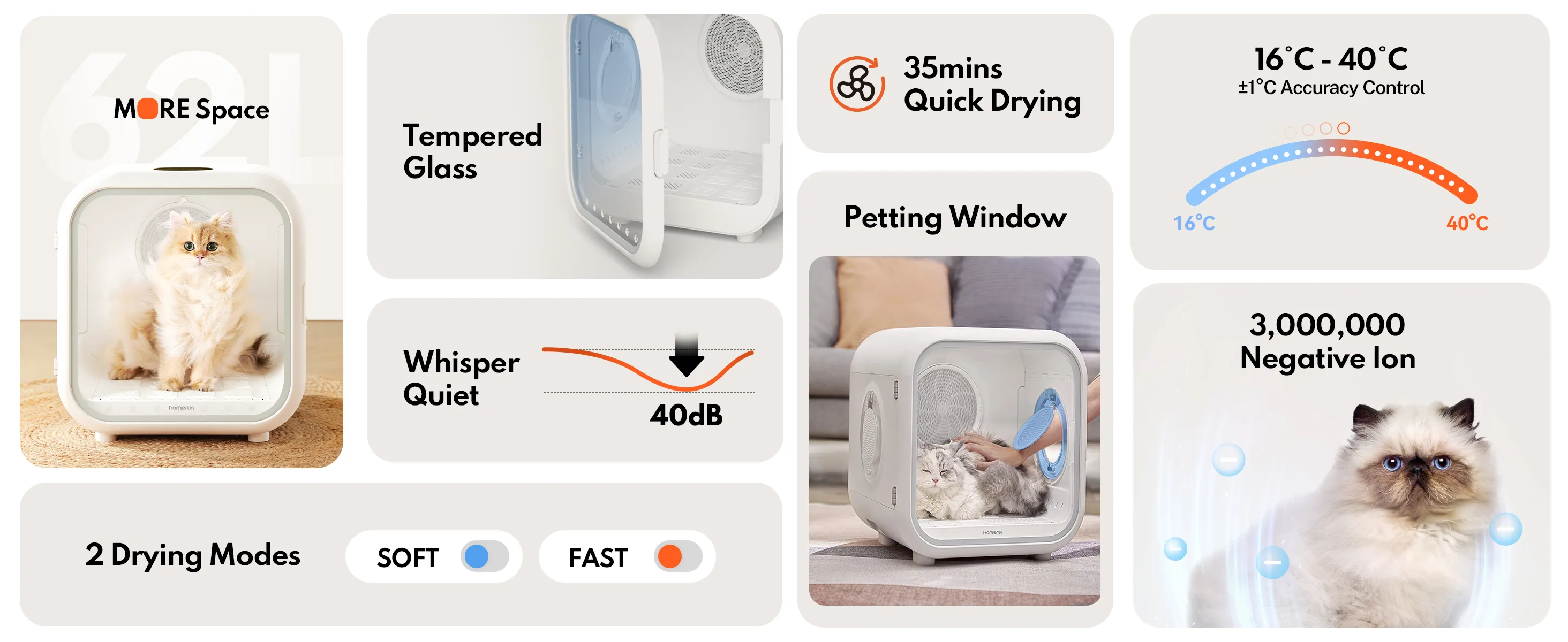 Its ultra quiet DC brushless fan operates at just 40 dB, while the Archimedes spiral air system ensures 360-degree airflow coverage with no dead angles. A high-precision sensor and multiple safety protections guarantee peace of mind during every use. More than just a dryer, this smart chamber also functions as a cosy pet nest and disinfection cabinet, offering year-round usability. With interactive windows, user-friendly touchscreen controls, negative ion care and multiple preset modes, the Drybo Smart Pet Dryer is a must-have for pet owners seeking comfort, cleanliness and convenience in one beautifully designed device.