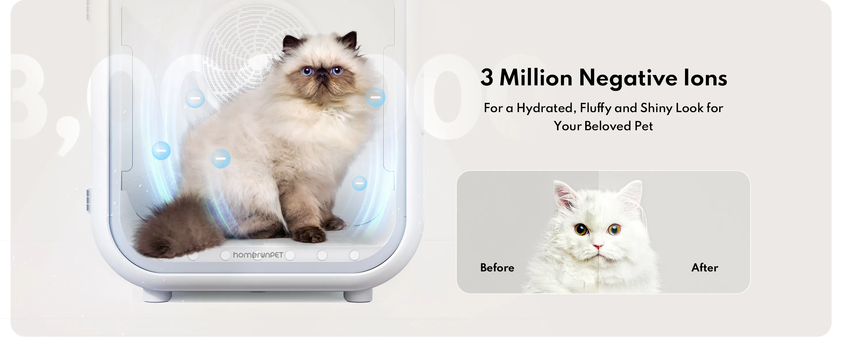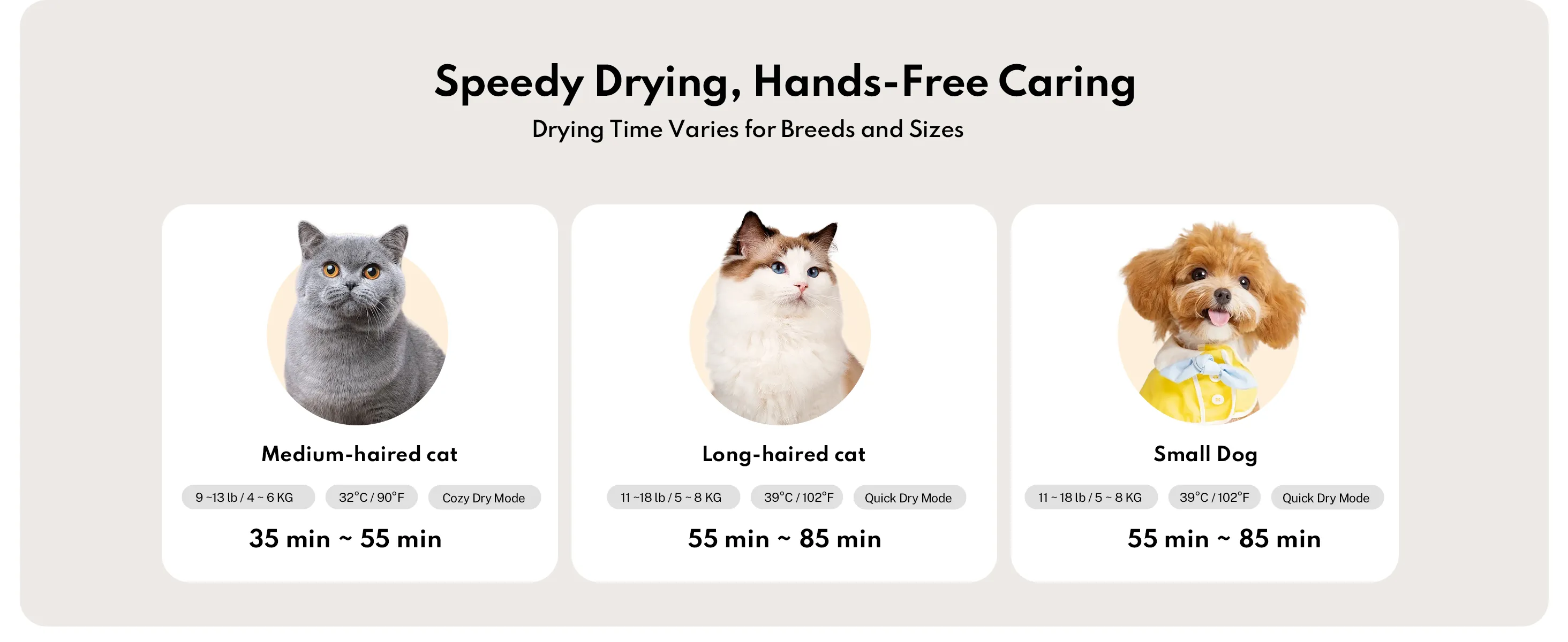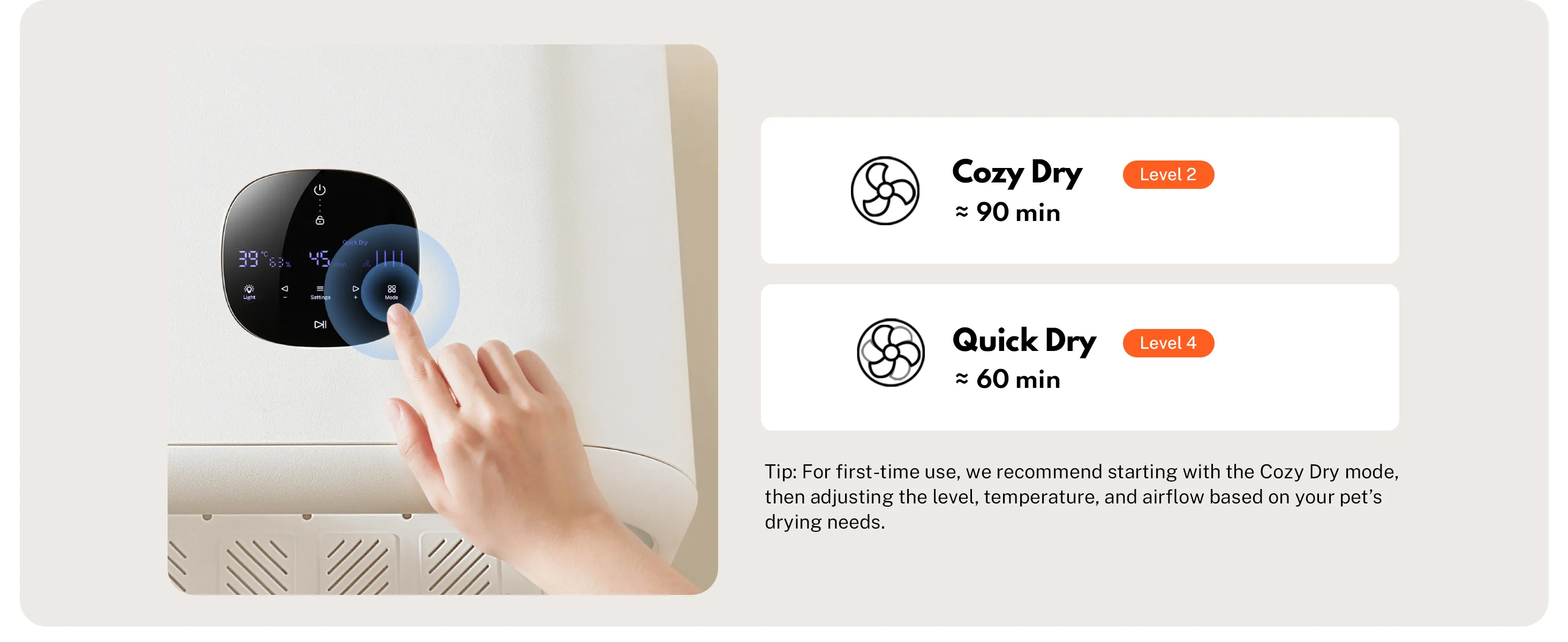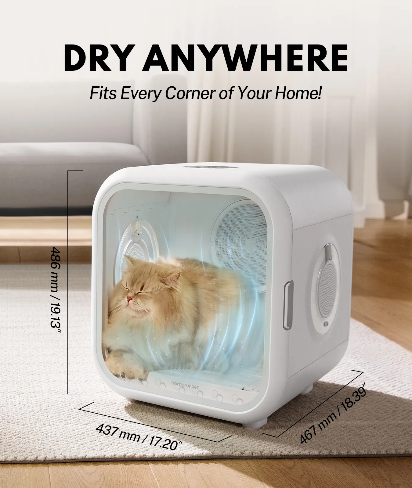 The HomeRunPet Drybo Smart Pet Dryer is a premium 62-litre intelligent drying chamber designed to provide your pets with salon-level comfort, hygiene and care. Combining advanced NTC frequency conversion technology and a gentle 39°C drying environment, it replicates the ideal warmth your pet naturally seeks. Whether used after bathing or for daily relaxation, the dryer delivers a quiet, even, and safe drying experience that reduces stress and enhances coat health.
