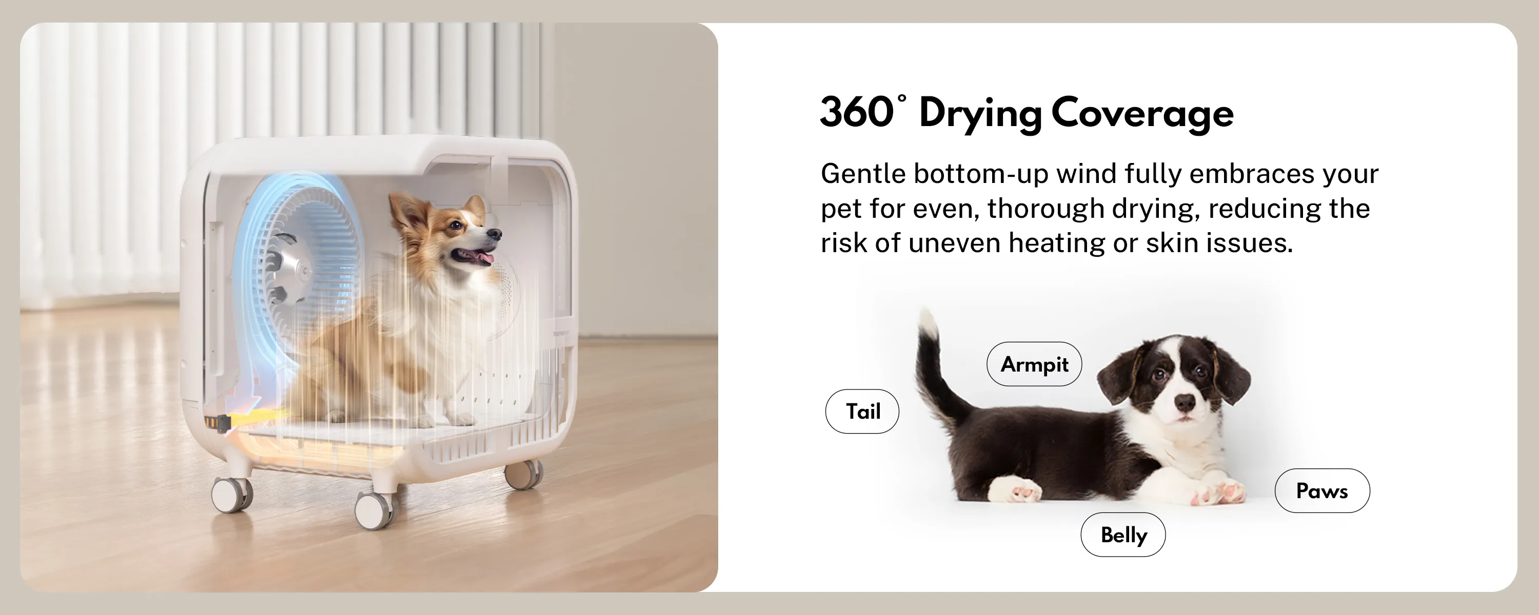 Say goodbye to stressful bath times and hello to effortless grooming with the Drybo Ultra Smart Pet Dryer, the ultimate all-in-one drying solution for modern pet owners. Designed with both comfort and performance in mind, Drybo Ultra delivers salon-quality drying from the convenience of your home. Its spacious, enclosed cabin creates a calm environment where your pet can relax while being dried evenly from all angles. No more noisy hairdryers or messy towels. With intelligent temperature and airflow control, the system automatically adjusts to ensure optimal comfort and safety. The smart touchscreen interface allows you to personalise settings based on your pet‘s size, coat type, and sensitivity, making it ideal for cats, small dogs, and even nervous pets.
