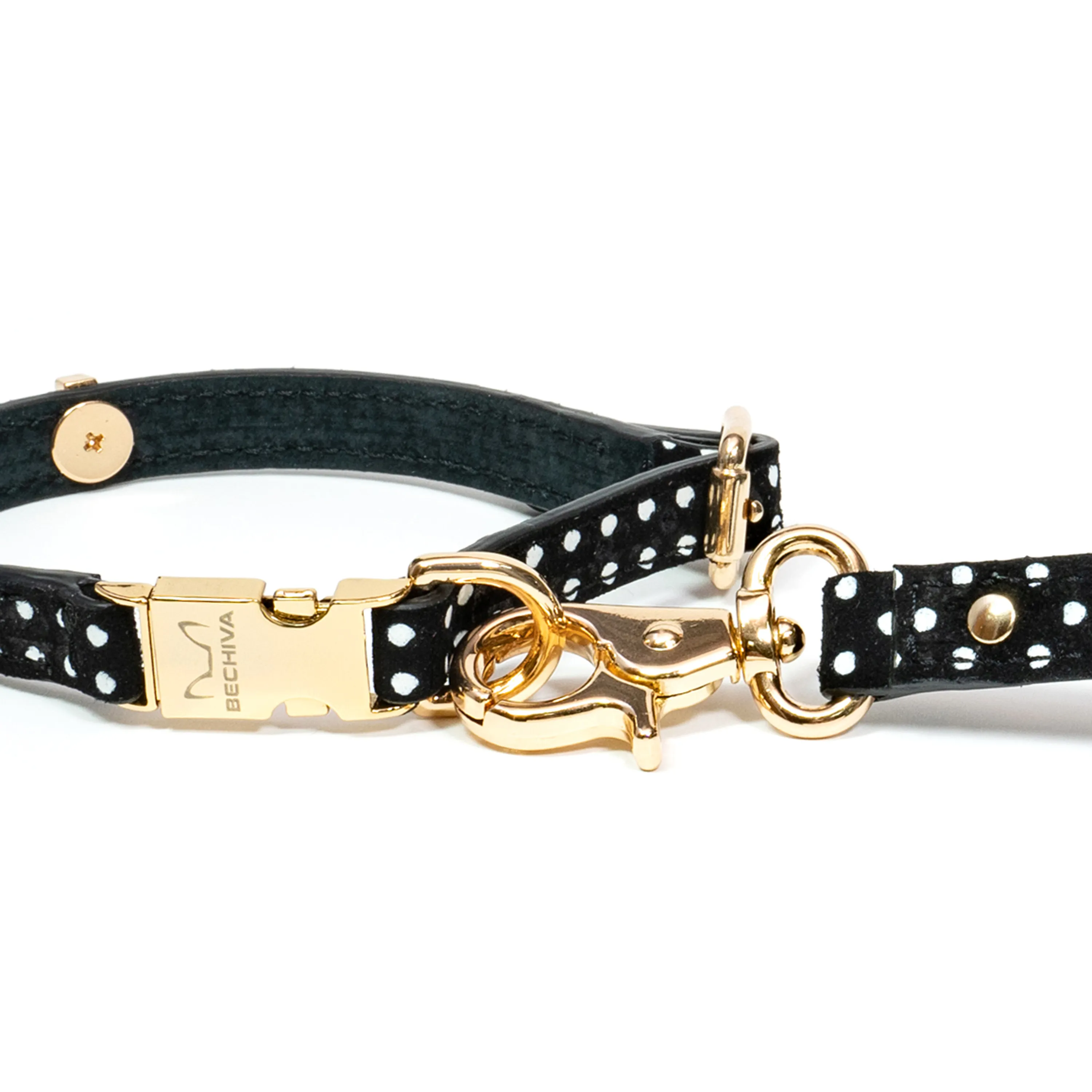 The sleek metal dog hook and matching D-ring allow for secure attachment and easy accessory use, such as waste bag holders. All hardware is Italian-made and available in gold, nickel, or black finishes to coordinate with your preferred look. Handcrafted in Europe and presented in Bechiva's signature gift box, this leash is a stylish addition to any walk and an elegant gift for pet lovers who appreciate premium design.