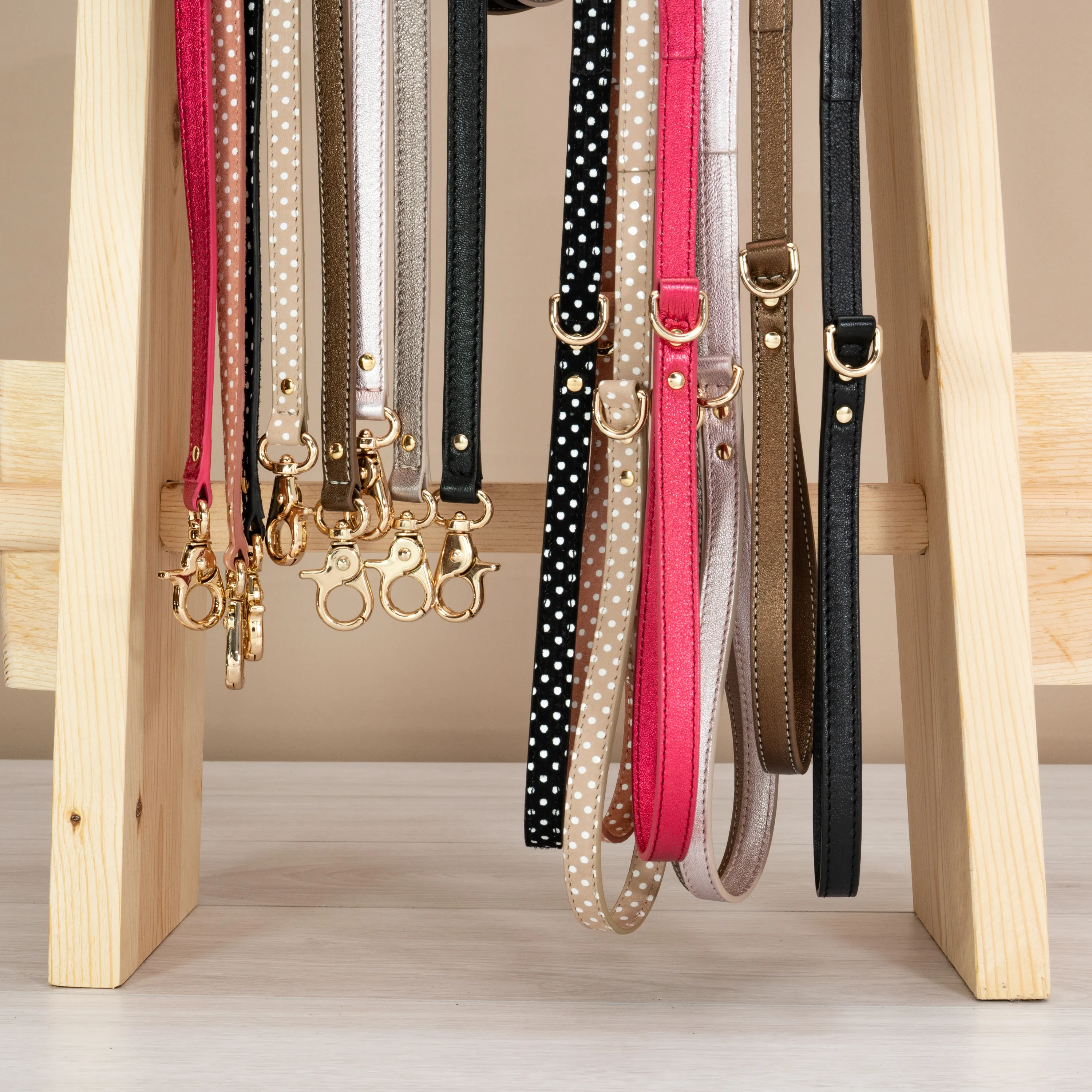 The sleek metal dog hook and matching D-ring allow for secure attachment and easy accessory use, such as waste bag holders. All hardware is Italian-made and available in gold, nickel, or black finishes to coordinate with your preferred look. Handcrafted in Europe and presented in Bechiva's signature gift box, this leash is a stylish addition to any walk and an elegant gift for pet lovers who appreciate premium design.