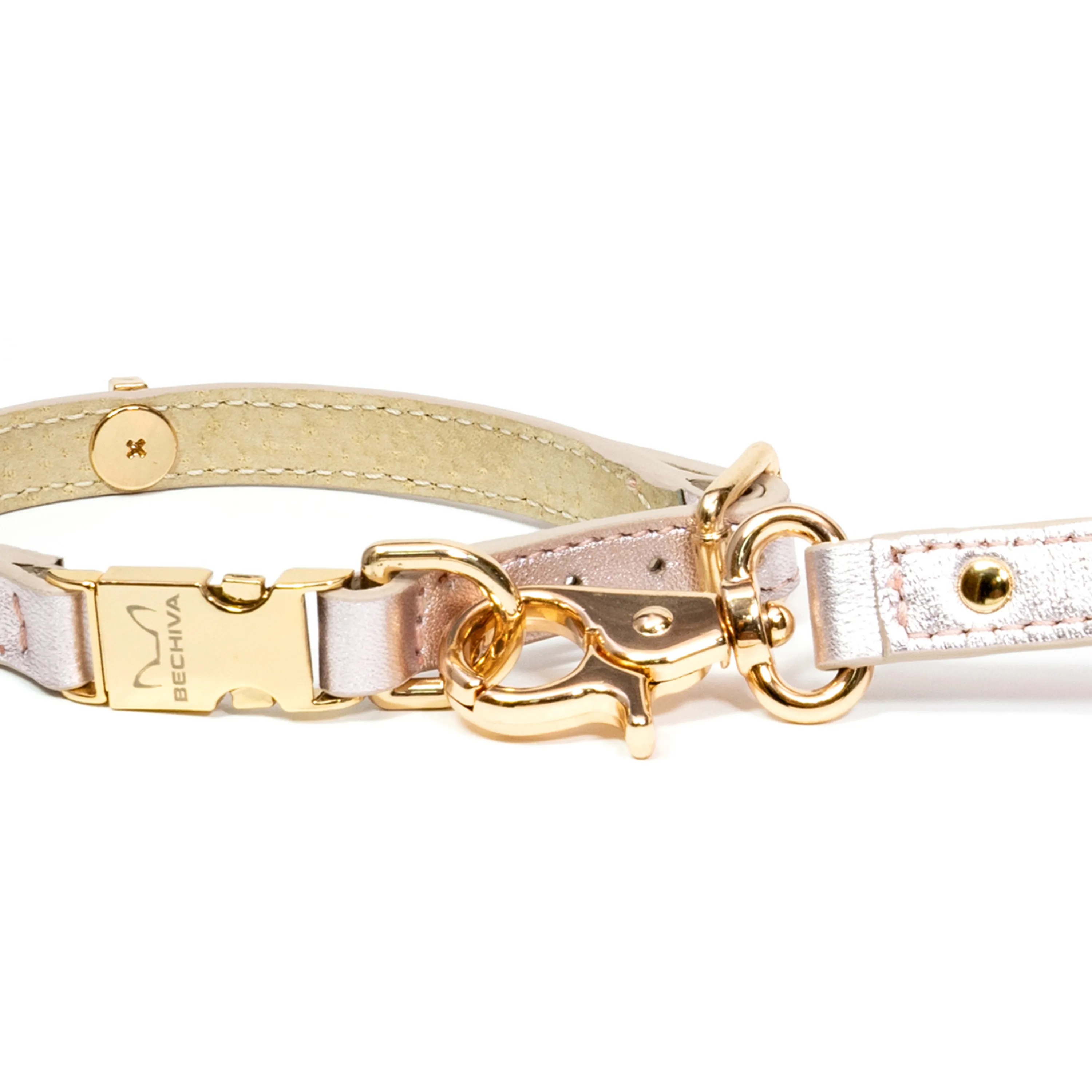 The sleek metal dog hook and matching D-ring allow for secure attachment and easy accessory use, such as waste bag holders. All hardware is Italian-made and available in gold, nickel, or black finishes to coordinate with your preferred look. Handcrafted in Europe and presented in Bechiva's signature gift box, this leash is a stylish addition to any walk and an elegant gift for pet lovers who appreciate premium design.