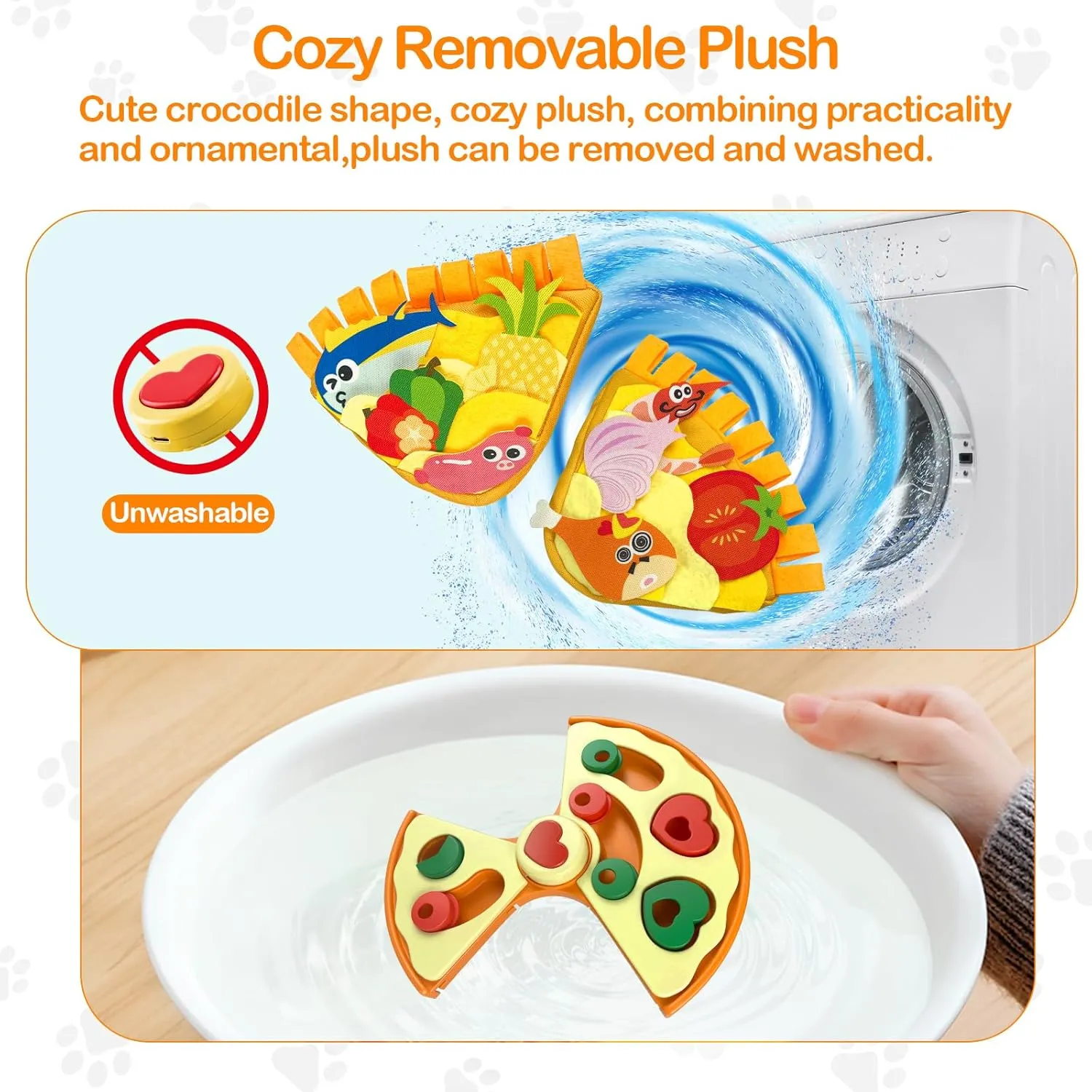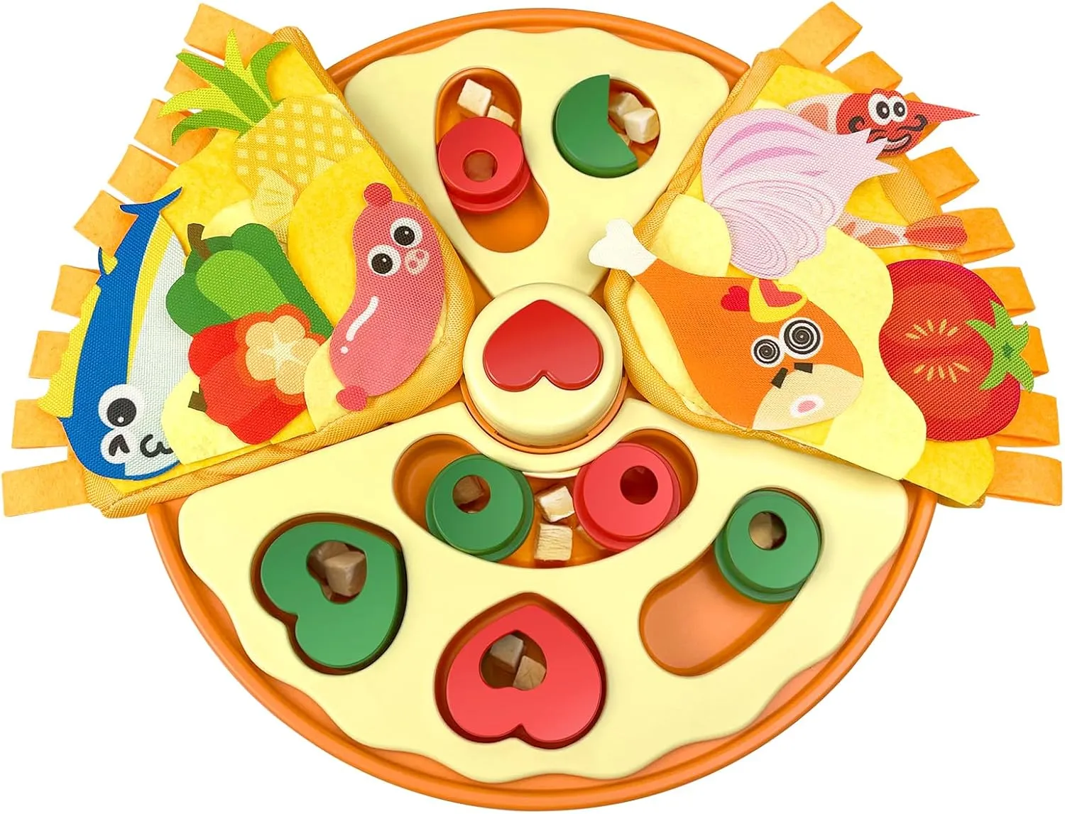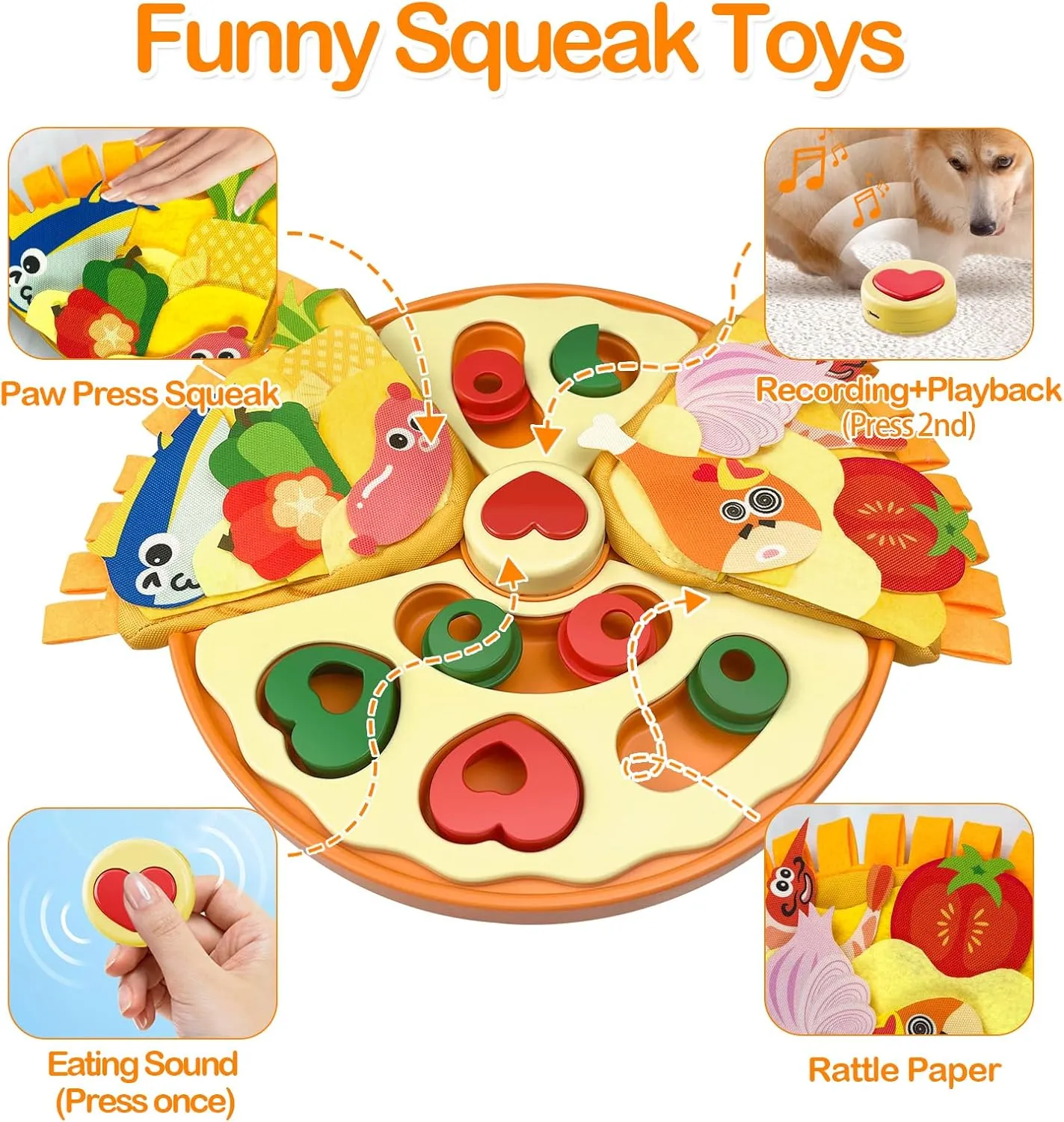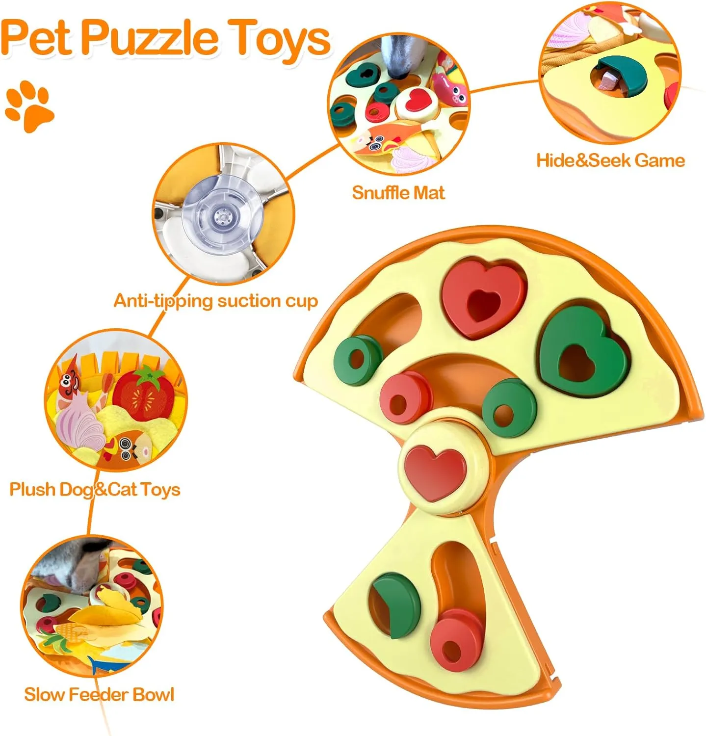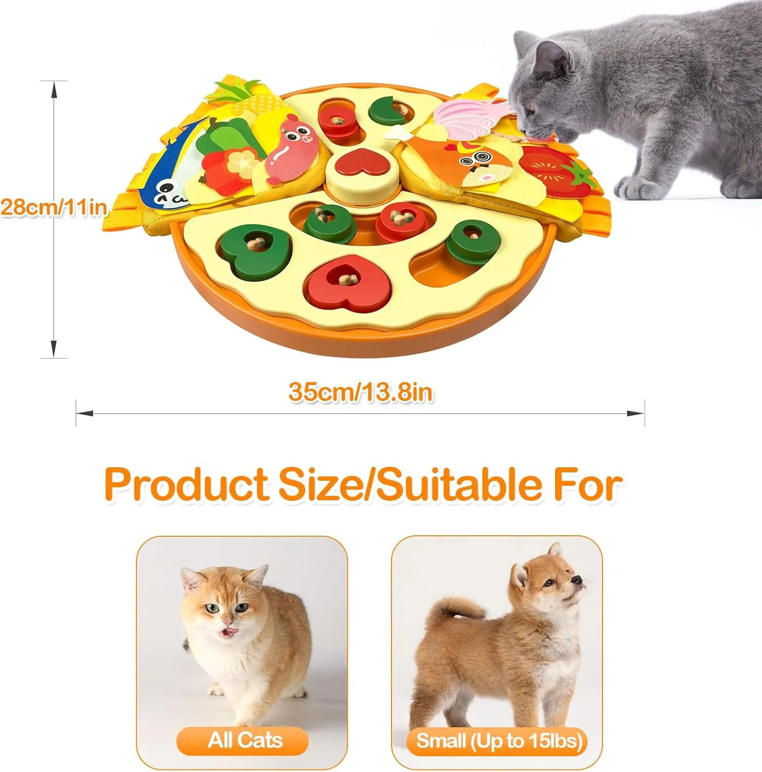 This is a puzzle toy feeder with multi-functions, a combination of slow feeding toy, pet enrichment toys, IQ training pet supplies,plush cat toy,cute Pizza appearance,electric toy,Snuffle mat and other functions, it can help improve pets intelligence.