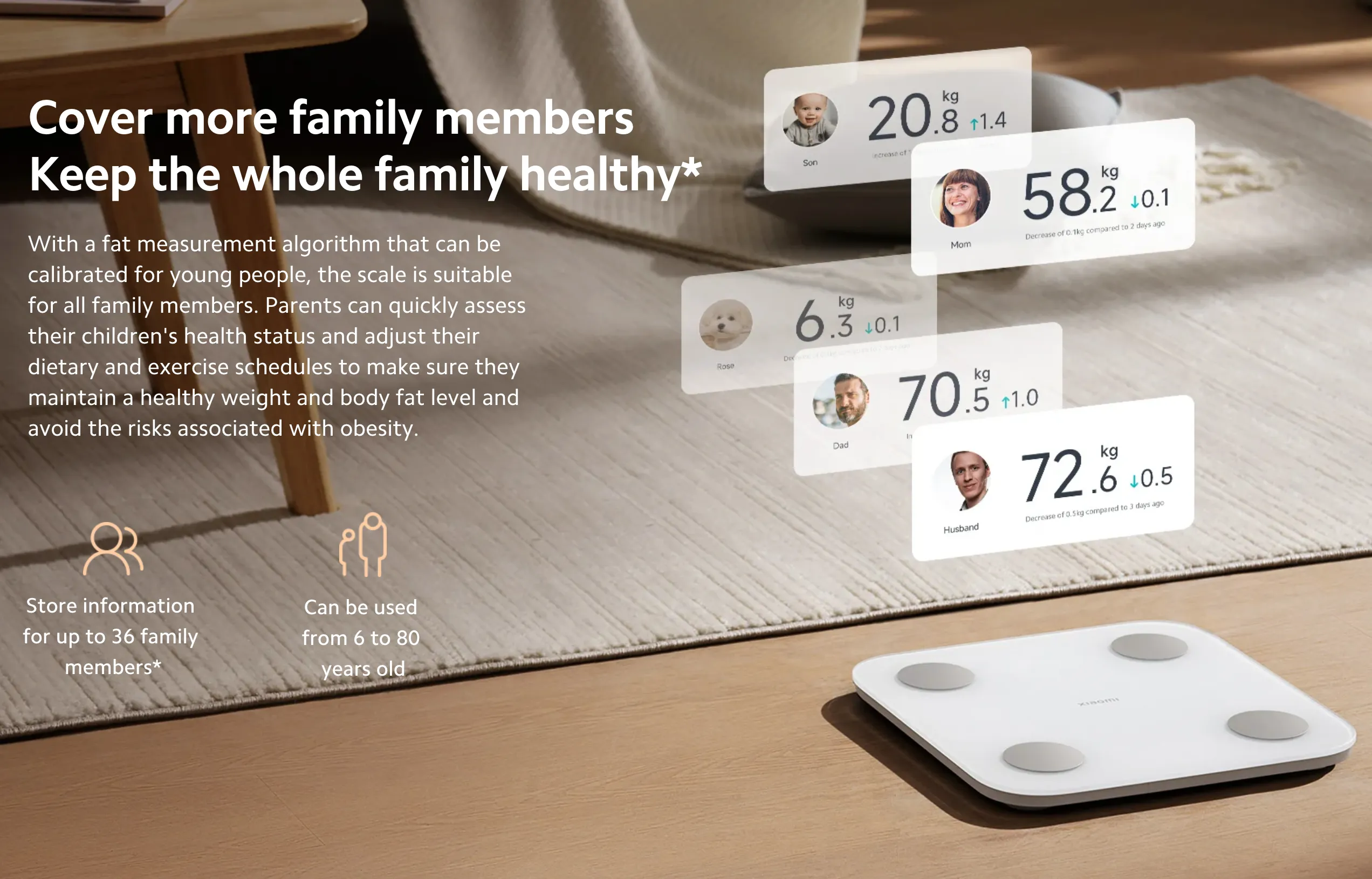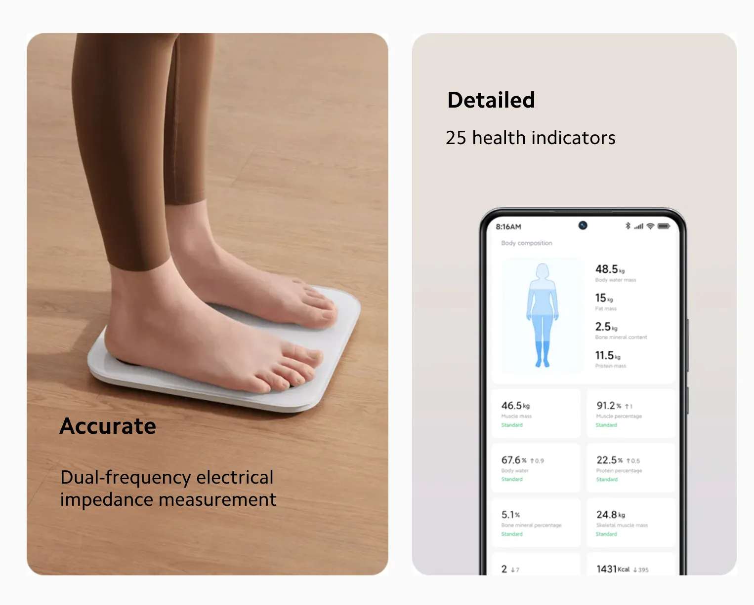 The Xiaomi Body Composition Scale S400 transforms a simple weigh-in into a comprehensive health assessment. Using dual-frequency BIA technology, it delivers near DEXA-level accuracy (correlation ≥ 0.93) to measure 25 key body metrics, including muscle mass, visceral fat, bone mineral density, body water, and heart rate. Designed for the whole family, it supports up to 36 user profiles with automatic recognition, plus guest and small-object weighing modes. With Bluetooth connectivity to the Mi Home app, sleek aesthetics, and up to 180 days of battery life, it is an elegant, intelligent addition to any home wellness routine.
