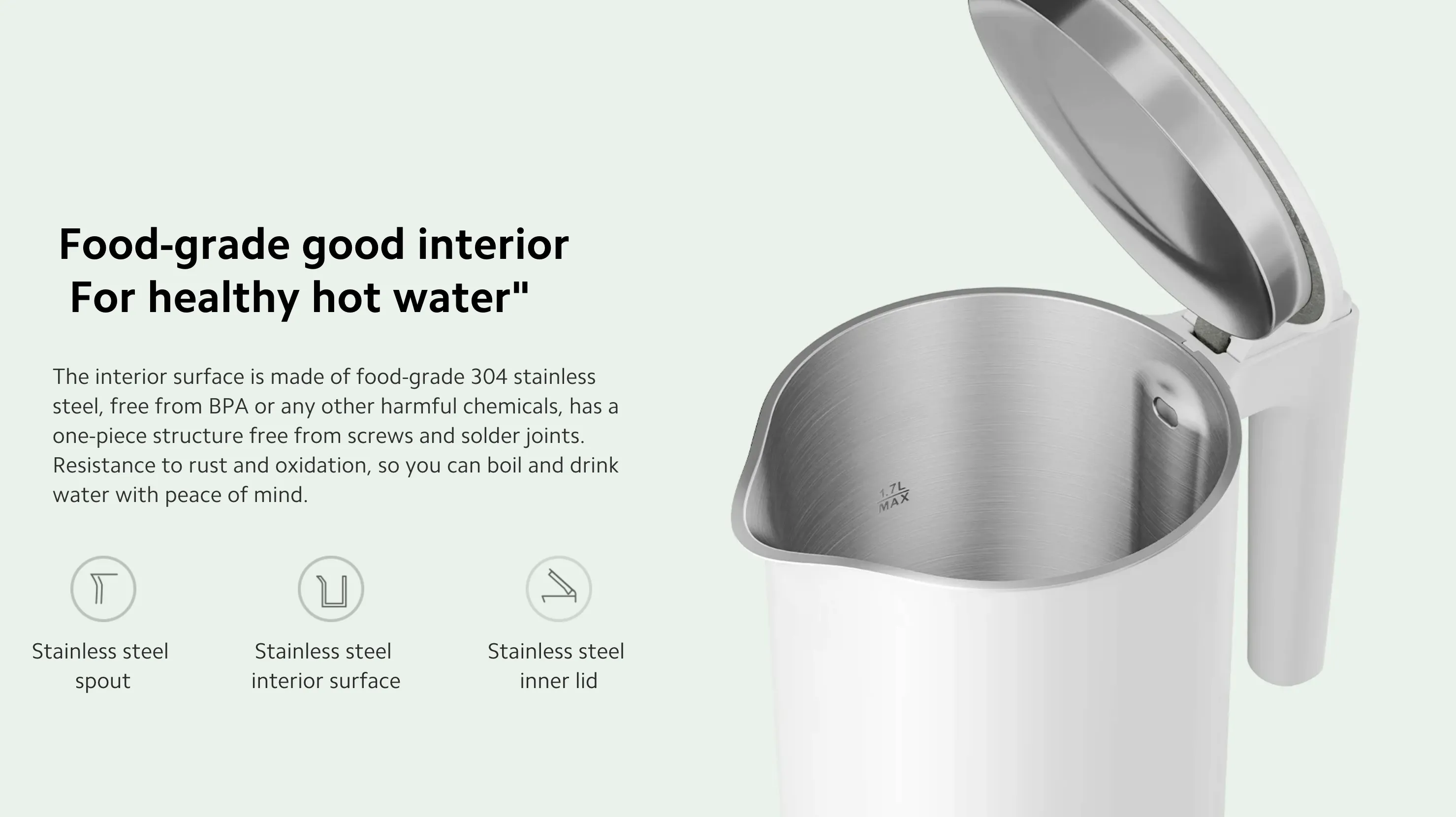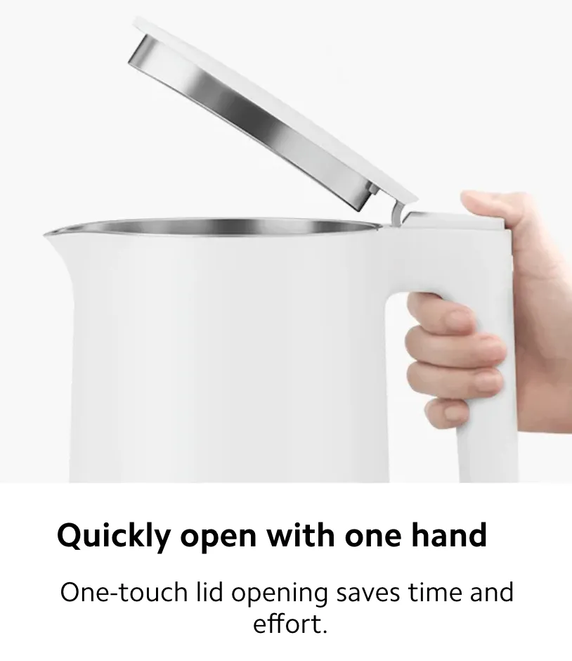 The Xiaomi Electric Kettle 2 combines fast performance, durable materials, and smart safety features in a sleek, modern design. With a generous 1.7L capacity, it boils up to 8 cups of water in just 5.5 minutes thanks to its powerful 1,800 W heating element faster than standard 1,500 W kettles. The seamless interior is made from food-grade 304 stainless steel, ensuring safe, pure-tasting water with no odours or residue. Double-layer insulation keeps the exterior cool to the touch, while a four-stage safety system auto shut-off, dry-boil protection, fuse protection, and safe-touch design delivers peace of mind with every use.